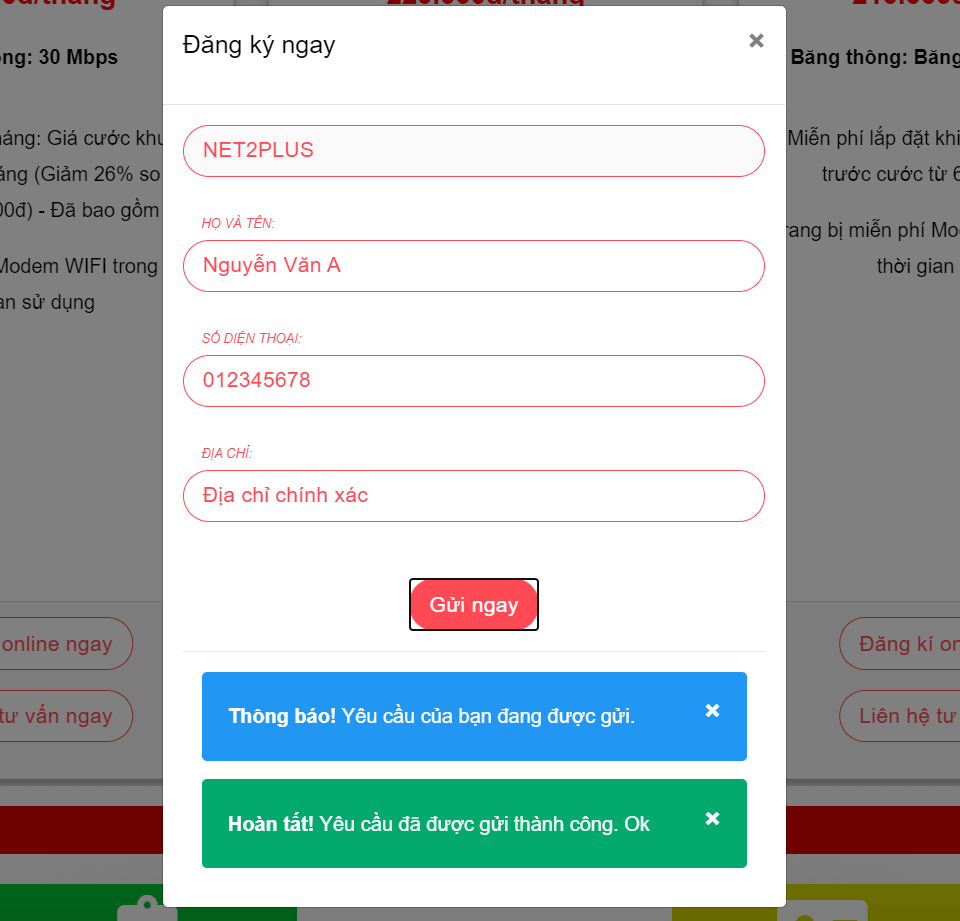 Sau khi đã chọn được gói cước phù hợp quý khách vui lòng chọn vào Đăng kí ngay. Và điền đầy đủ cũng như chính xác thông tin của mình.